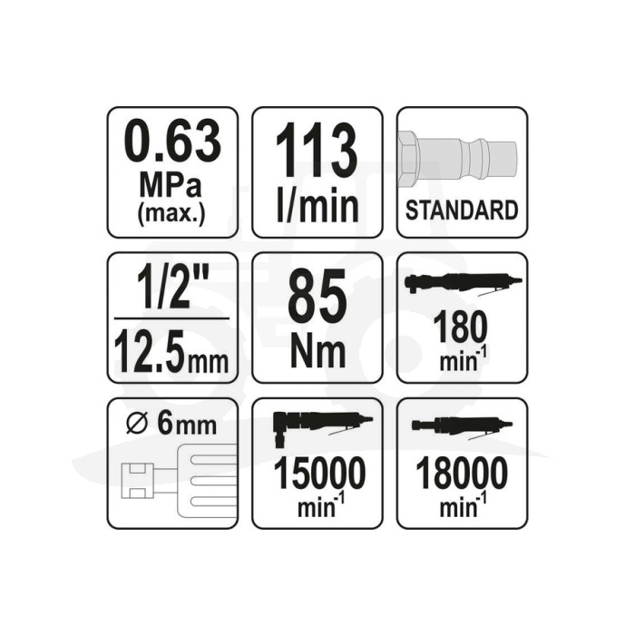 | Obroty | grzechotki: 180, szlifierki prostej: 18 000, szlifierki kątowej: 15 000 obr./min |